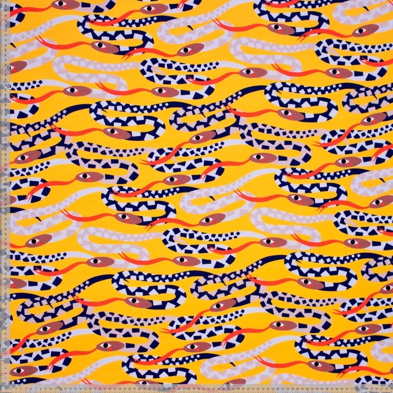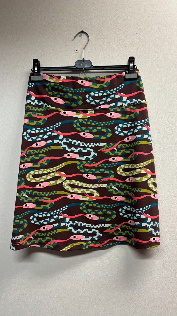 Licht klokkend rokje van mooie tricot van katoen met retro print van slangen op bruin. Met dubbele heup-pas en elastische draad in de taille. Ook beschikbaar in gele variant tricot.